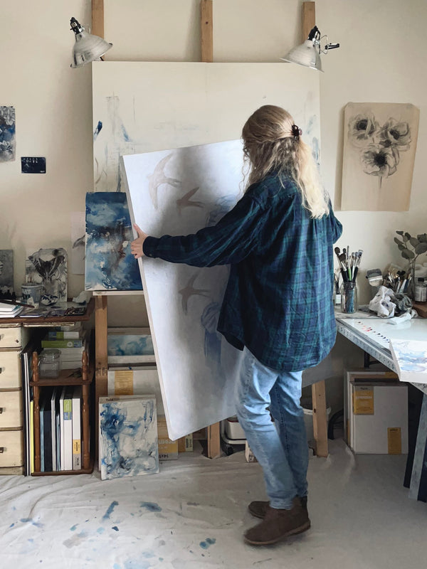 Rebekah Vermeulen (b. 1996 in El Paso, Texas) is a contemporary painter based in Tucson, Arizona. She started drawing after the sudden onset of an autoimmune disease at eighteen. Over the following years, Rebekah saw a return in her health and an increasing passion for art that led her to pursue an education in painting. She works with different combinations of india ink, acrylic paint, and oil paint on canvas, and is best known for creating representational paintings interwoven with abstract elements and recurring motifs such as birds and florals